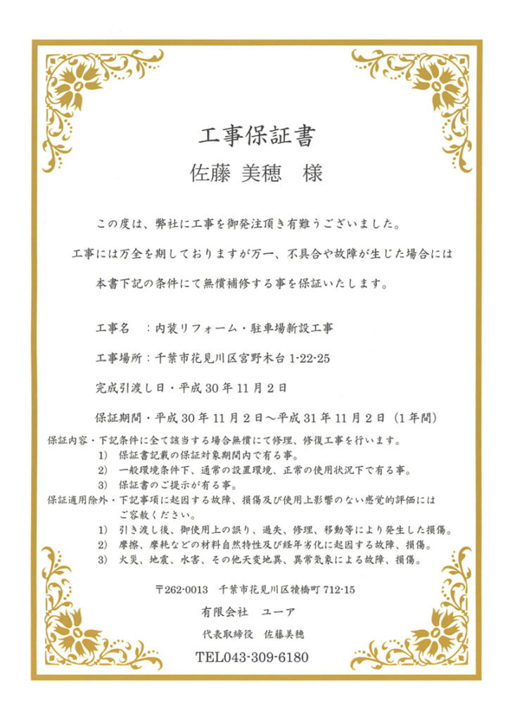 工事には万全を期しておりますが、万一の不具合や故障が生じた場合に、補償内容・期間内であれば無償補修を保証しております。工事中の安心はもちろん、工事後の安心も大切に考えています。